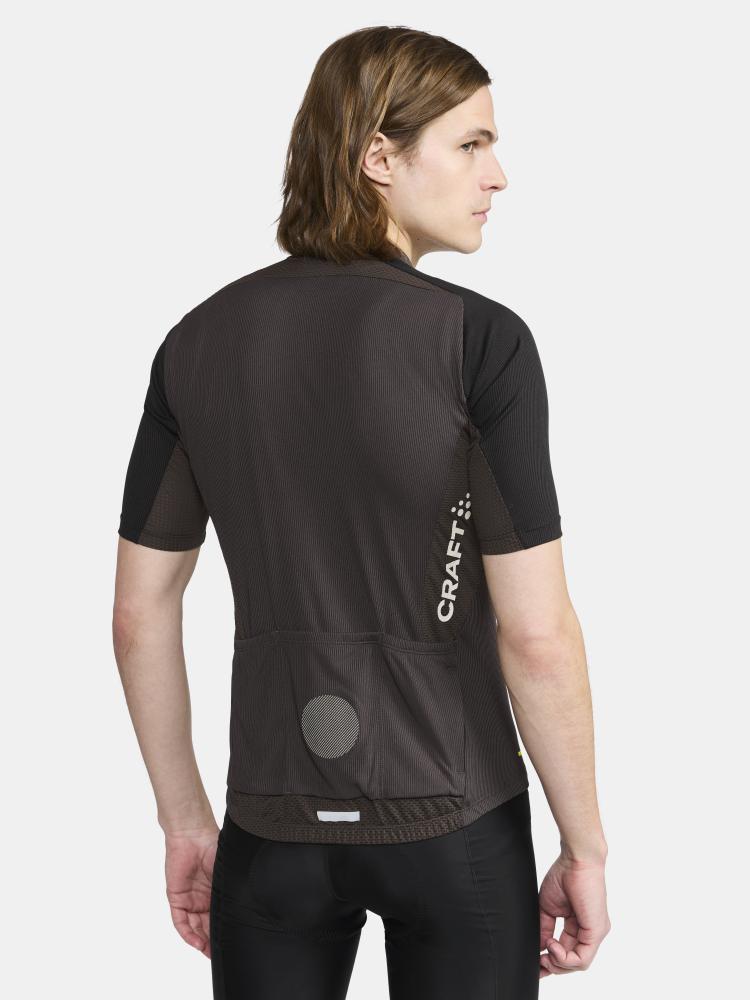 This advanced cycling jersey is made of a soft and stretchy rib fabric that provides excellent moisture transport during intense rides. The fabric is made from recycled polyester and its rib structure creates air channels for efficient ventilation as well as a soft touch for optimal comfort. In addition, body-mapped mesh panels provide enhanced ventilation while silicone print at back bottom hem keeps the jersey in place. The jersey also has four back pockets for efficient storage. Tight fit.