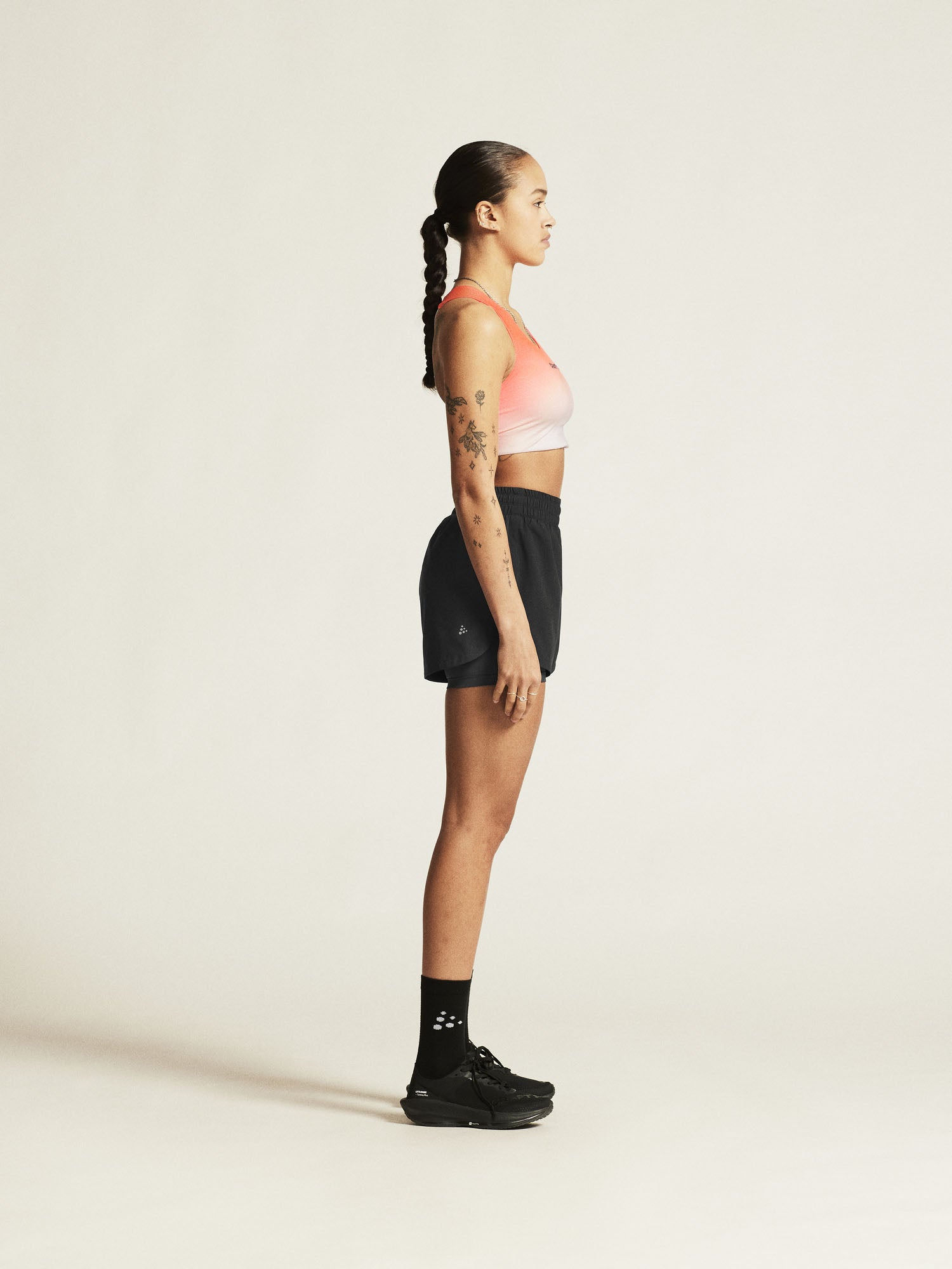 • Functional stretch fabric made from recycled polyester and elastane • Inner tights for optimal support • Wide elastic jersey waist • Adjustable drawcord inside waistband • Phone pouch on inner tights • Key pocket • Reflective prints • Inseam approximately 9 cm in size M